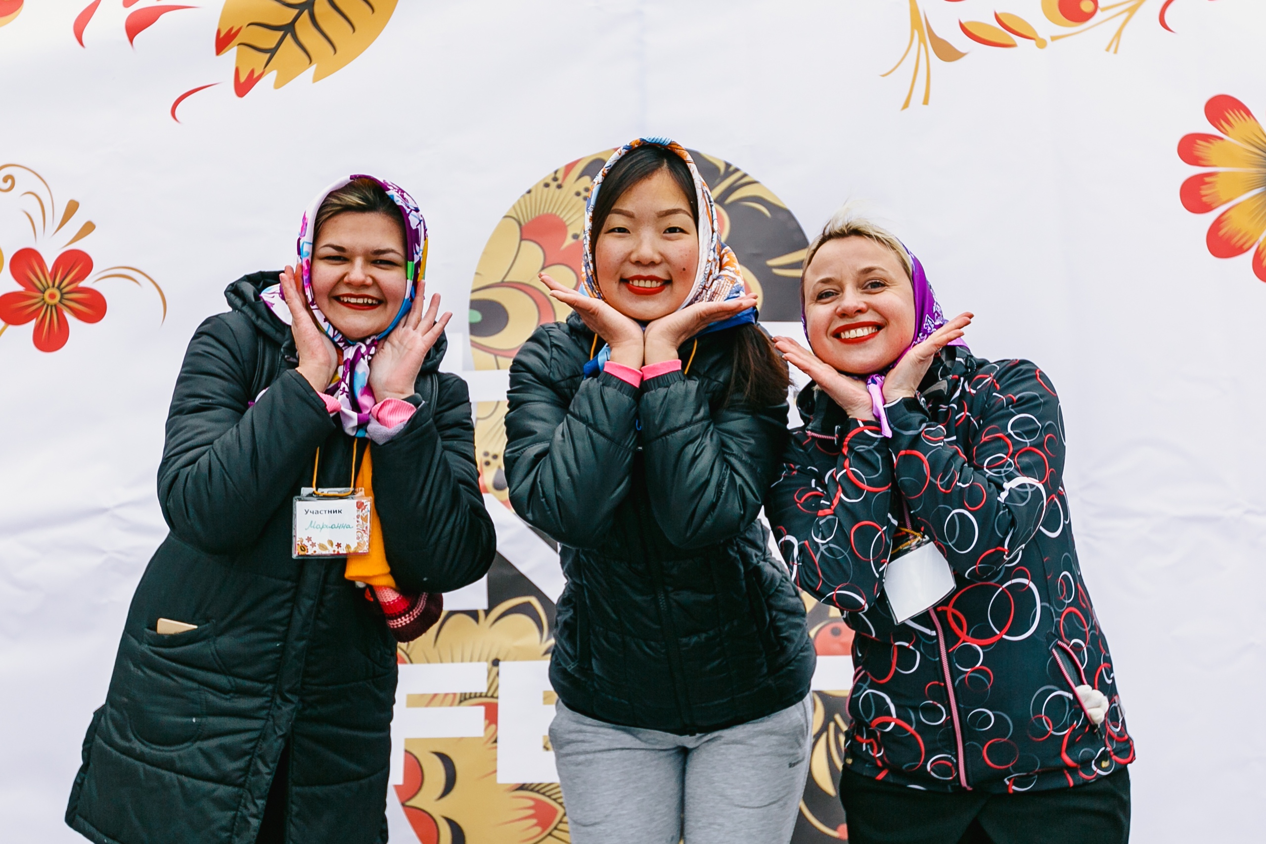 Пространство фестиваля было оформлено в традиционном русском стиле: с золотой матрешкой от студентов Школы дизайна и стеной с граффити, где каждый мог оставить надпись или рисунок. На чайной и блинной станции гости могли попробовать горячие блины, перевести дух и согреться.